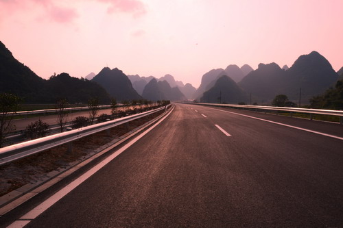 从崇左向靖西,一路向西,黝黑路面、乳白标线,一路延伸。
