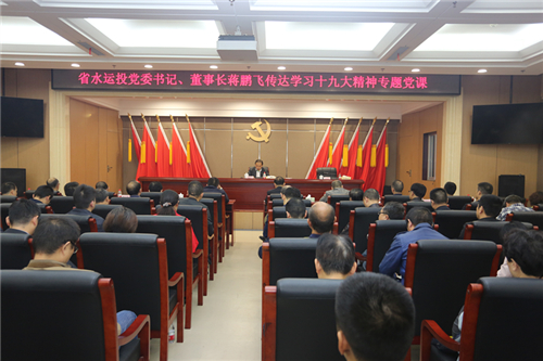 2017年11月10日下午,省水运投集团党委书记、董事长蒋鹏飞同志以《学习贯彻落实十九大精神,推动改革发展,实现集团公司“功能”“效益”双提升》为题带头讲专题党课,推动党的十九大精神在集团公司落地生根。 蒋鹏飞的党课报告分三大部分依次展开。第一部分,结合其自身学习体会,对党的十九大报告进行了详细的解读,重点提炼出了“新时代、新思想、新目标、新要求”等4个关键词;第二部分,按照十九大精神的要求,作为集团公司的主要负责人,他结合集团实际和自己的思考,深入浅出地诠释了集团公司的改革发展内涵,为集团未来发展明确了方向;第三部分,对集团公司的当前各项工作提出具体要求。