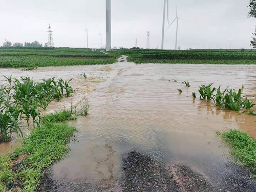 7月22日,河南浚县降雨量达654毫升,由湖南湘电能源工程科技有限公司负责运维管理的浚县象山风电场110kV升压站受到暴雨严重影响,场区部分检修道路和升压站围墙外护坡被冲毁,风机、箱式变压器周边道路积水严重,对风电场正常运行造成重大威胁。