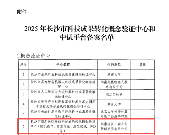 根据长沙市科学技术局近日正式印发的《关于2025年长沙市科技成果转化概念验证中心和中试平台备案的通知》(长科发〔2025〕31号),由湖南省医工融合创新研究院有限公司(以下简称“医研院”)牵头组建的“长沙市创新医疗器械科技成果转化概念验证中心(脑机接口、智慧诊断、康复器械、IVD等)”已成功通过备案,正式列入市级概念验证中心名单。