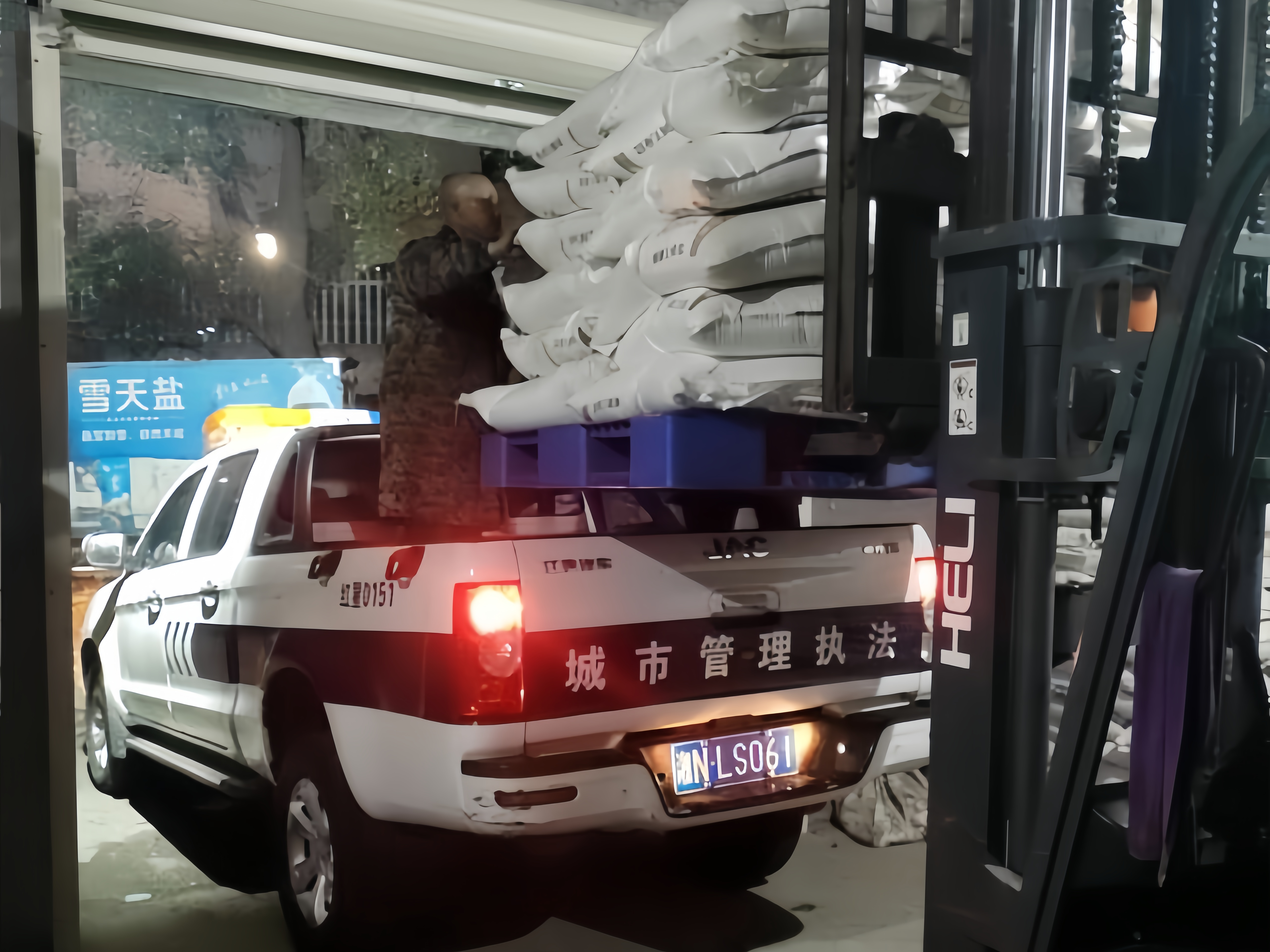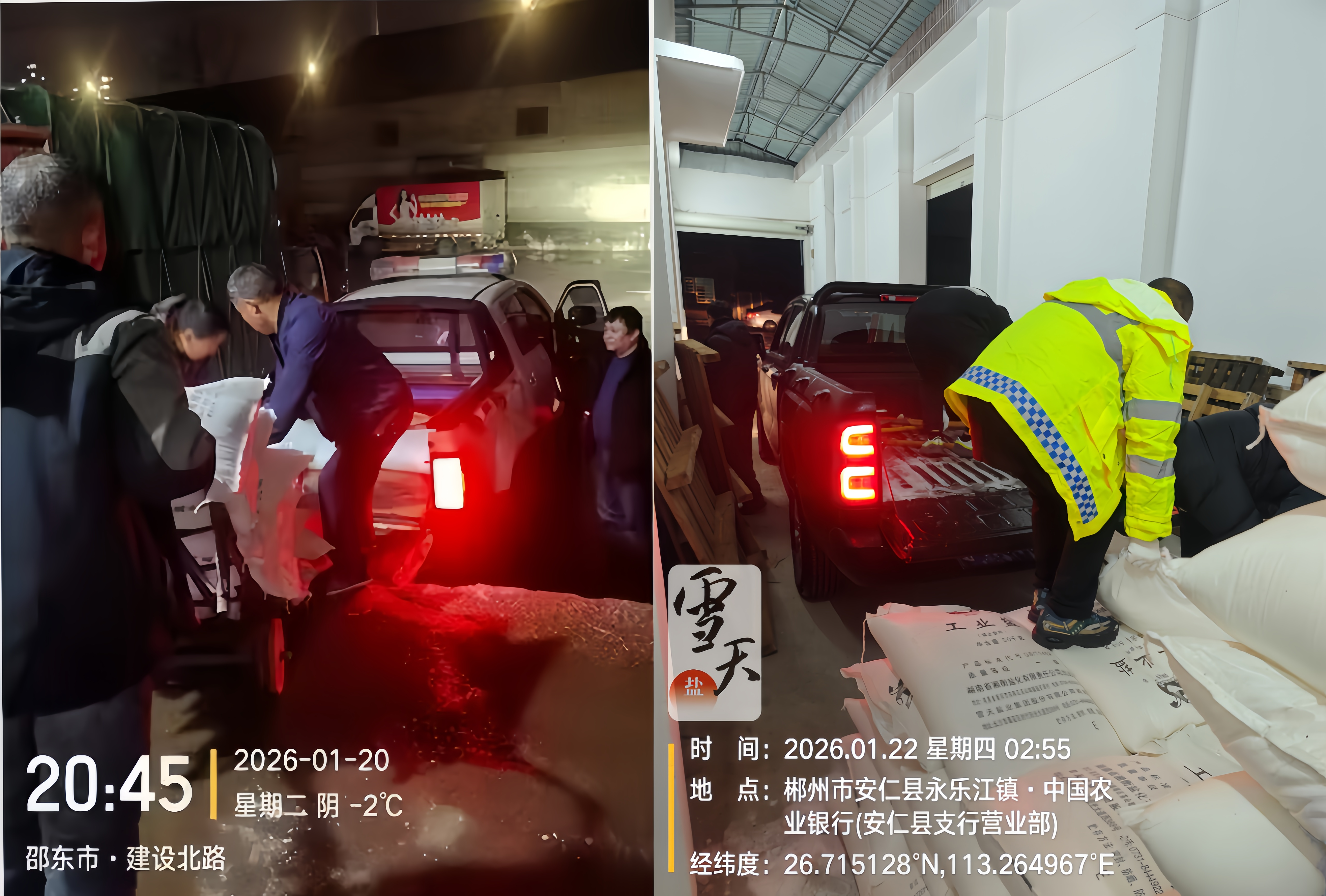 为确保应急响应及时,雪天盐业启动冰冻天气应急保供预案,各单位开通24小时值班热线,领导干部带头值守,全员24小时待命。湘南分公司1月22日凌晨接到政府紧急采购需求后,快速完成订单核对、货物清点、装车配送,确保融雪盐第一时间运往除冰一线。