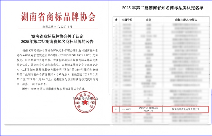 2026年1月,湖南健朗药业有限责任公司(简称“健朗药业”)旗下核心商标品牌“健朗药业”成功入选2025年第二批湖南省知名商标品牌认定名单。这是继“健朗”商标获评2025年第一批“湖南省知名商标品牌”之后,健朗药业在品牌建设领域的又一重要突破,标志着公司品牌影响力与市场公信力获得省级权威持续认可。