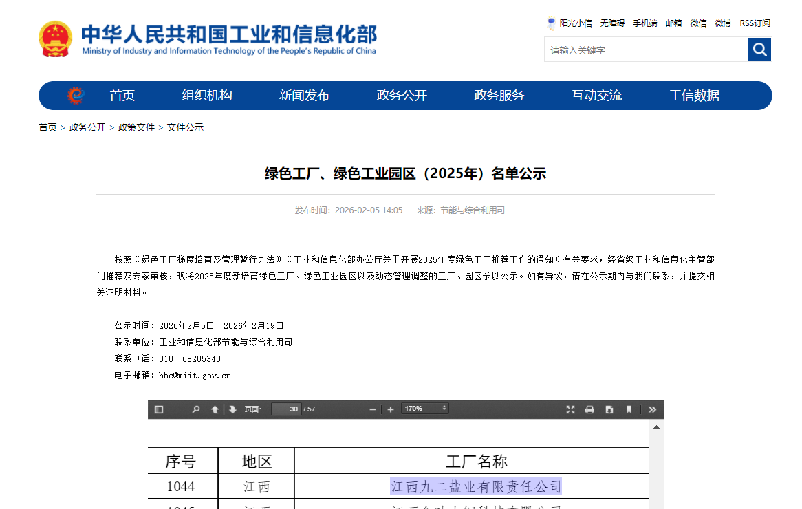 近日,工业和信息化部公示2025年绿色工厂名单,雪天盐业集团股份有限公司所属江西九二盐业有限责任公司(以下简称“九二盐业)成功入选,获得国家级“绿色工厂”认证。