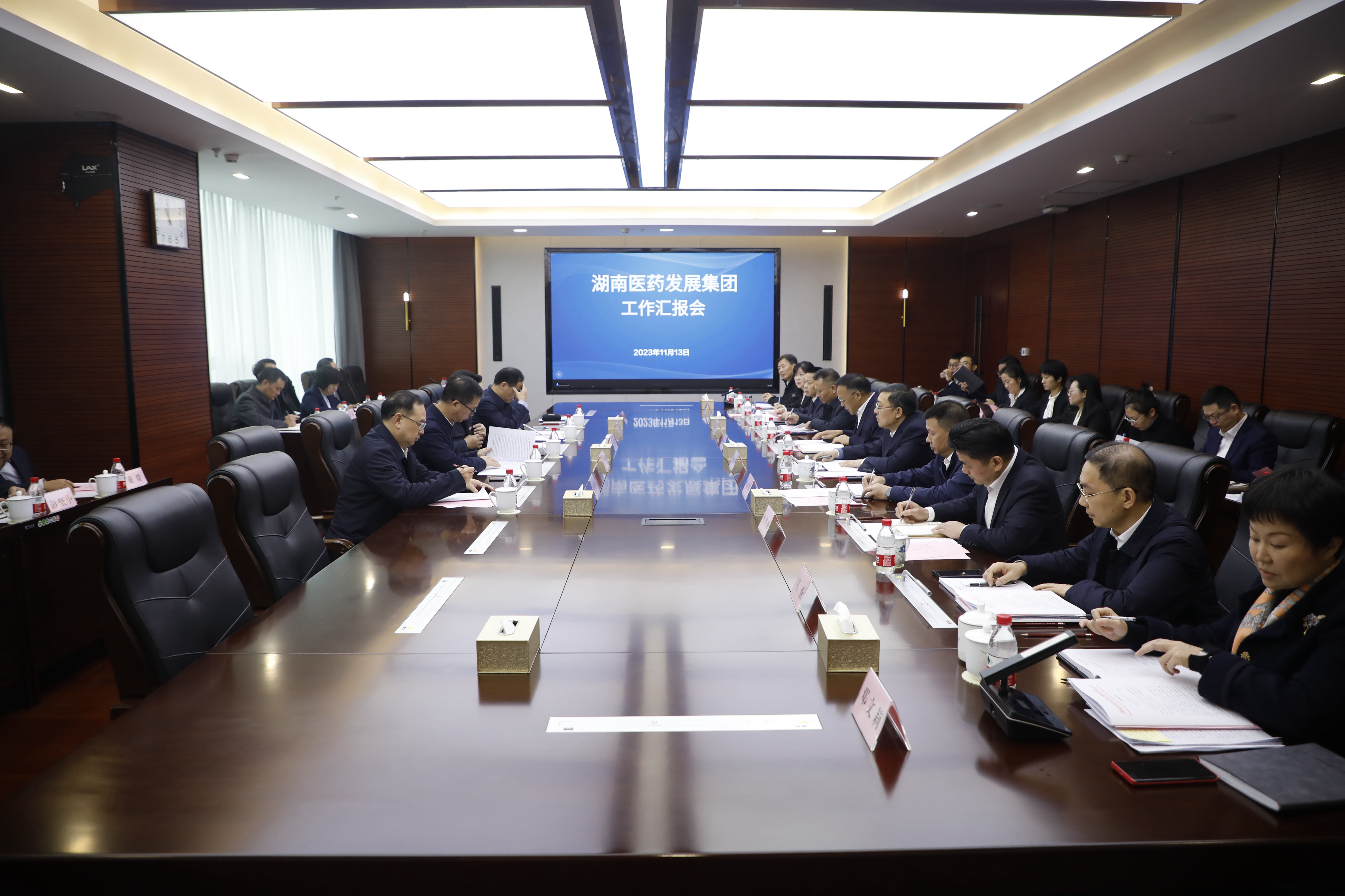 11月13日上午,副省长秦国文带队到湖南医药发展集团调研企业改革发展情况,并召开座谈会详细听取相关工作汇报。省卫健委主任李小松,省国资委党委书记、主任肖文伟,省国资委党委副书记、副主任杨晓喻,省医保局副局长孙兆泉参加调研。湖南医药发展集团党委书记、董事长胡新保,党委副书记、副董事长、总经理苏德辉,党委副书记、职工董事刘晓,党委委员宋海滨、赵智海、李智诚、张洁、莫众参加座谈。