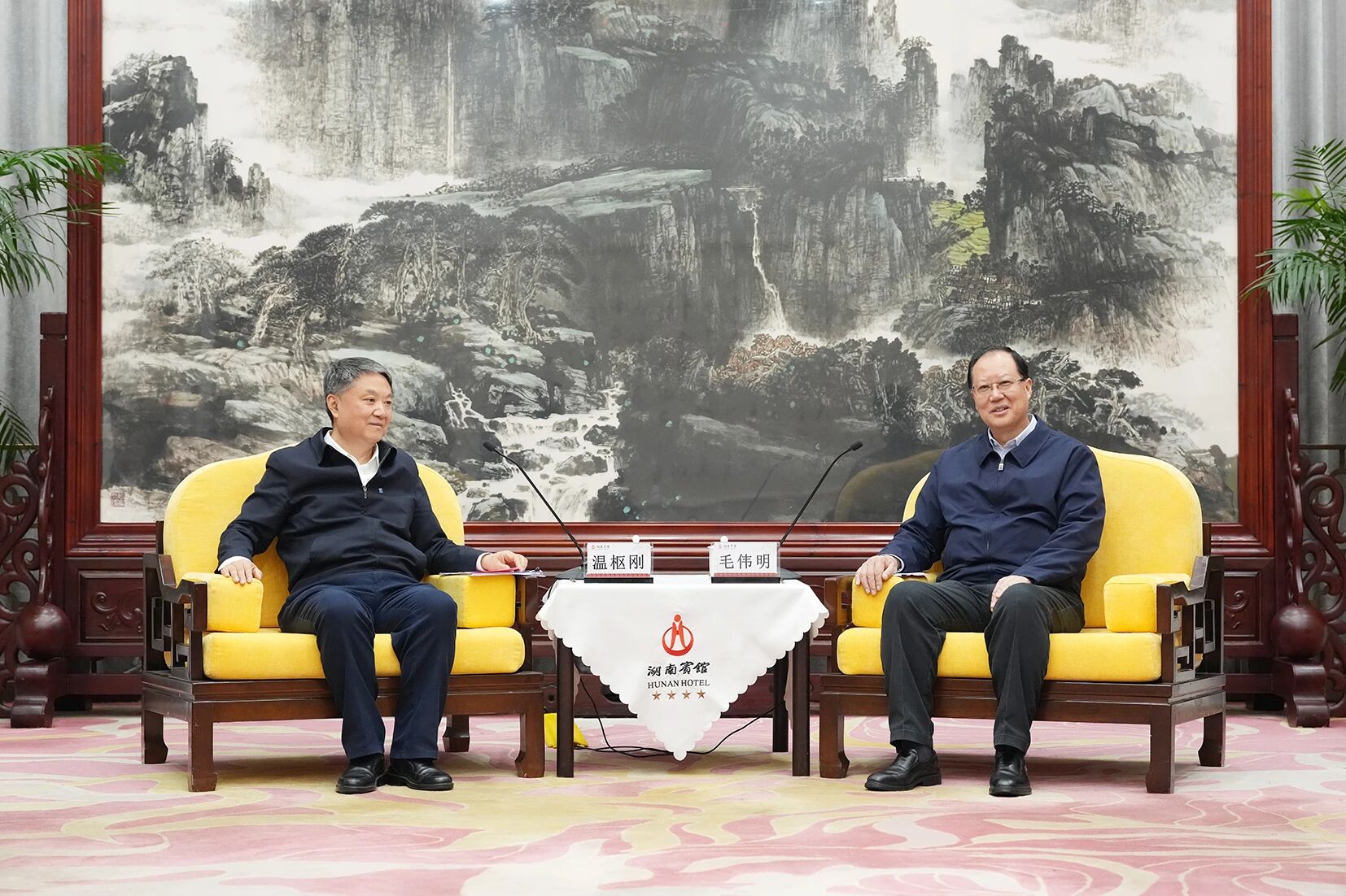 4月22日下午,省政府与中国华能集团有限公司在长沙举行工作会谈,深入贯彻习近平总书记关于能源工作的重要论述,携手推进具有湖南特色的新型电力系统建设。省委副书记、省长毛伟明,中国华能董事长、党组书记温枢刚出席。